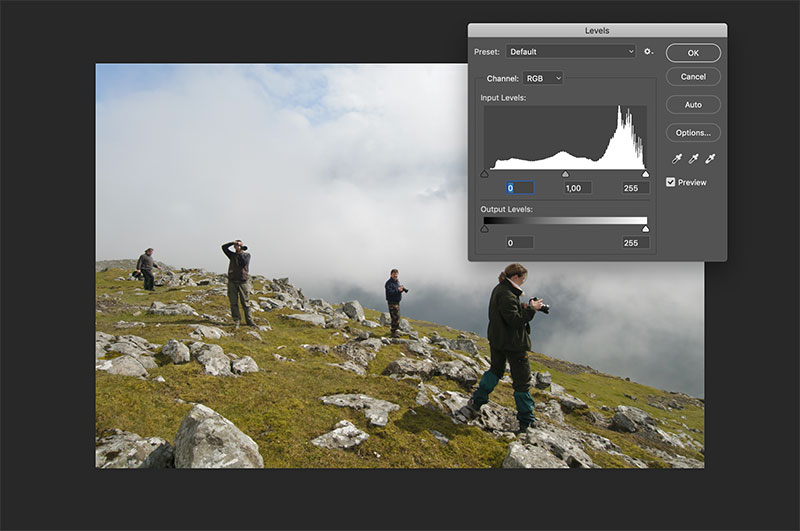 A fenti ködben készült képünket szeretnénk egy kicsit felturbózni a Levels (Szintbeállítás) segítségével. A menüben az Image/Adjustments/Levels úton juthatunk el a megfelelő ablakhoz, ahol javítunk a kép tónusarányán, a fekete csúszkát a görbe kezdetéig húzzuk.