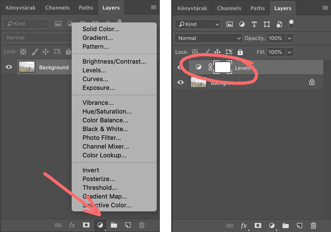 A Layers panelen (ha nem látszik, a Window/Layers menüpont alatt találod) lent, középen a félig tele karikára kattintva tudsz új korrekciós réteget felvenni. Ha itt kiválasztod a Levels-t, akkor a menüből megnyitotthoz hasonló ablakot kapsz, ahol a csúszkát elhúzva pont ugyanazt az eredményt kapod mint az előbb. A különbség, hogy bármikor, mentés után, újra nyitáskor is rá tudsz kattintani a layer-ek között erre és ugyanzt fogod látni mint amikor létrehoztad és beállítottad.